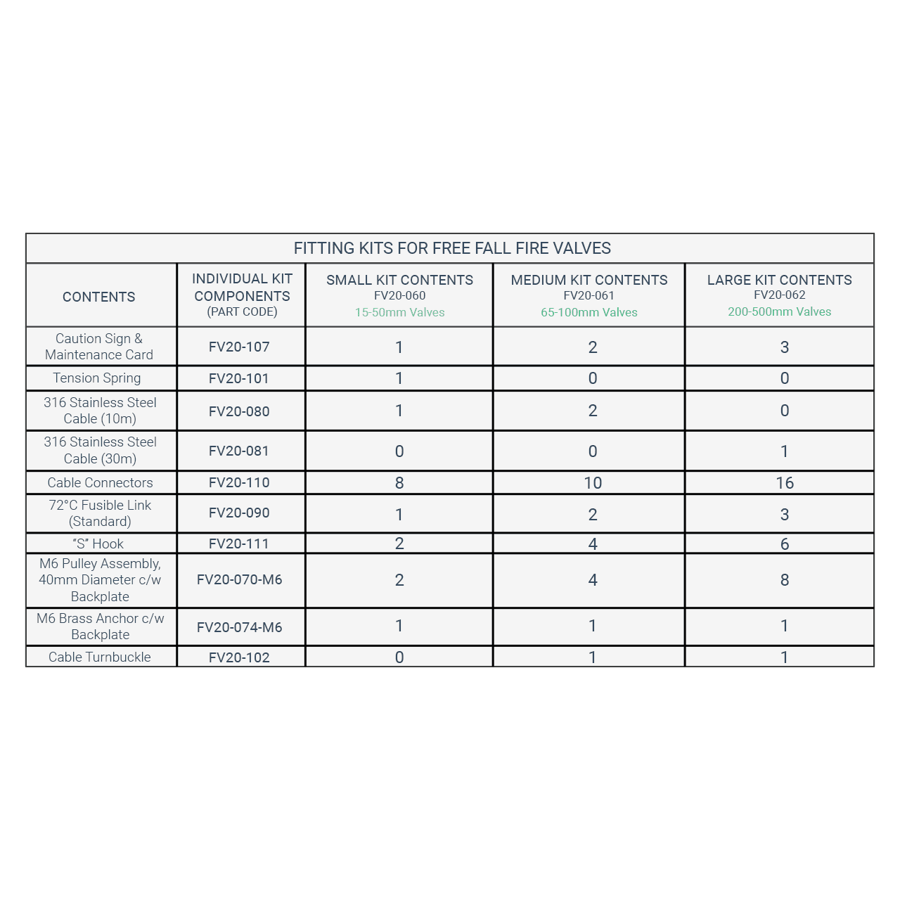 | Spare Parts | Caution Sign & Maintenance Card, Tension Spring for 15-40mm Valves, Tension Spring for 50-80mm Valves, 316 Stainless Steel Cable 10m, 316 Stainless Steel Cable 30m, Cable Connectors, Galvanised Steel Cable 7.5m, 72°C Eutectic Soldered Fusible Link C/W ‘S’ Hooks, 92°C Eutectic Soldered Fusible Link C/W ‘S’ Hooks, ‘S’ Hook, M6 Pulley Assembly – 40mm Diameter C/C Backplate, M6 Brass Anchor C/W Backplate, Cable Turnbuckle |